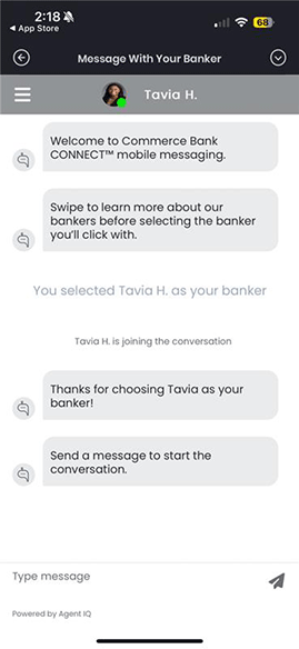 With Commerce Bank CONNECT™ mobile messaging, you can interact directly with a real person — a banker you’ve chosen, who can help you find the solutions you need, because they’ve gotten to know you and your goals. And the best part is, they’re as close as your smartphone.